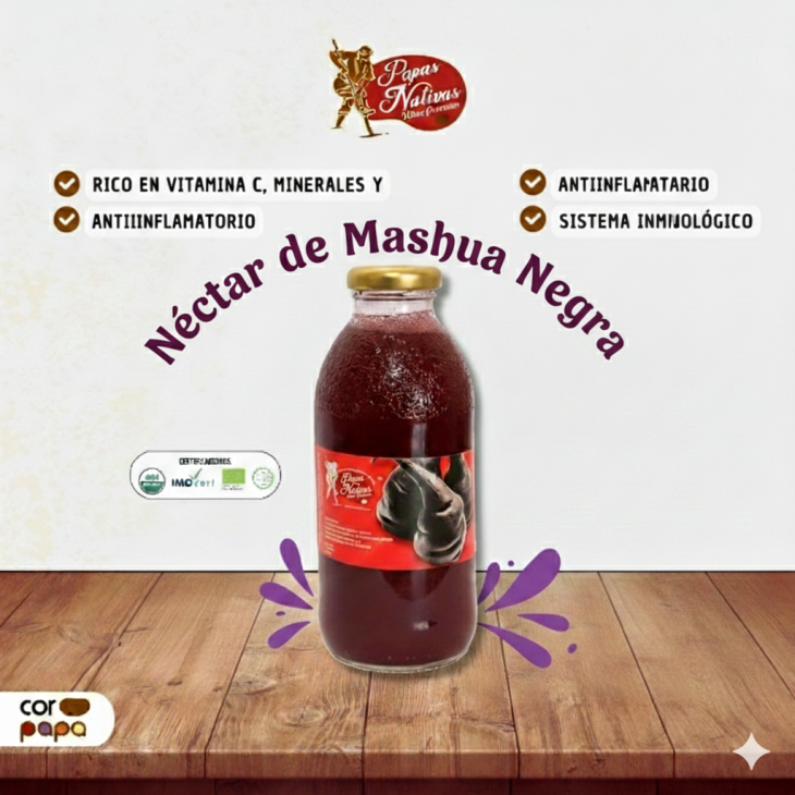 Néctar de mashua, un superalimento andino rico en vitamina C, minerales y glucosinolatos. Este producto natural posee propiedades antiinflamatorias y fortalece el sistema inmunológico. Cuenta con certificaciones orgánicas internacionales que garantizan su alta calidad y pureza.