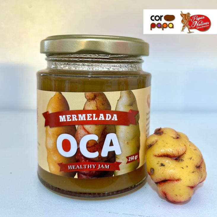 Esta mermelada saludable de oca (250 g) es un producto natural elaborado con tubérculos andinos seleccionados. Destaca por ser alta en antioxidantes, combatir el envejecimiento y ayudar significativamente al sistema digestivo, contando con certificaciones orgánicas internacionales.