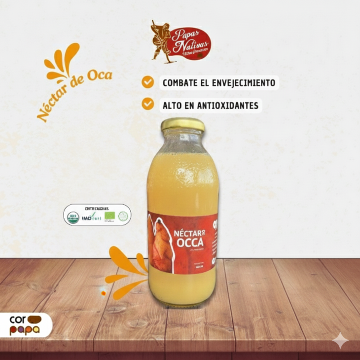 El Néctar de Oca es una bebida natural que combate el envejecimiento gracias a que es alta en antioxidantes. Su consumo regular ayuda significativamente al sistema digestivo. Además, cuenta con certificaciones orgánicas internacionales que garantizan su pureza.